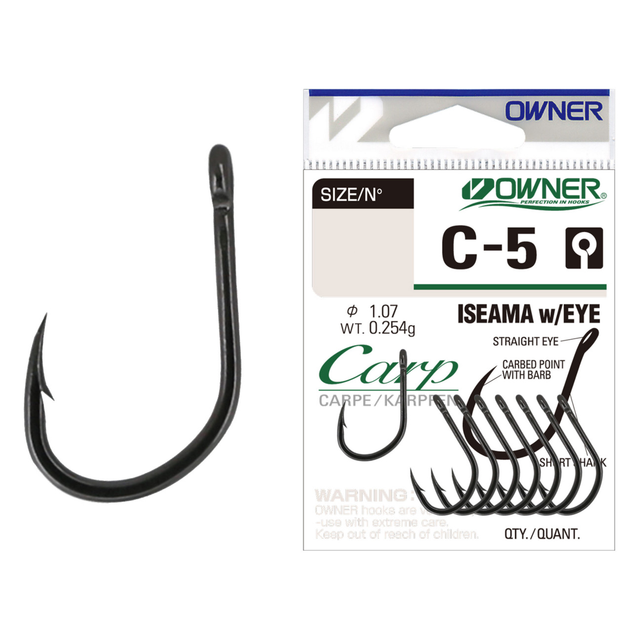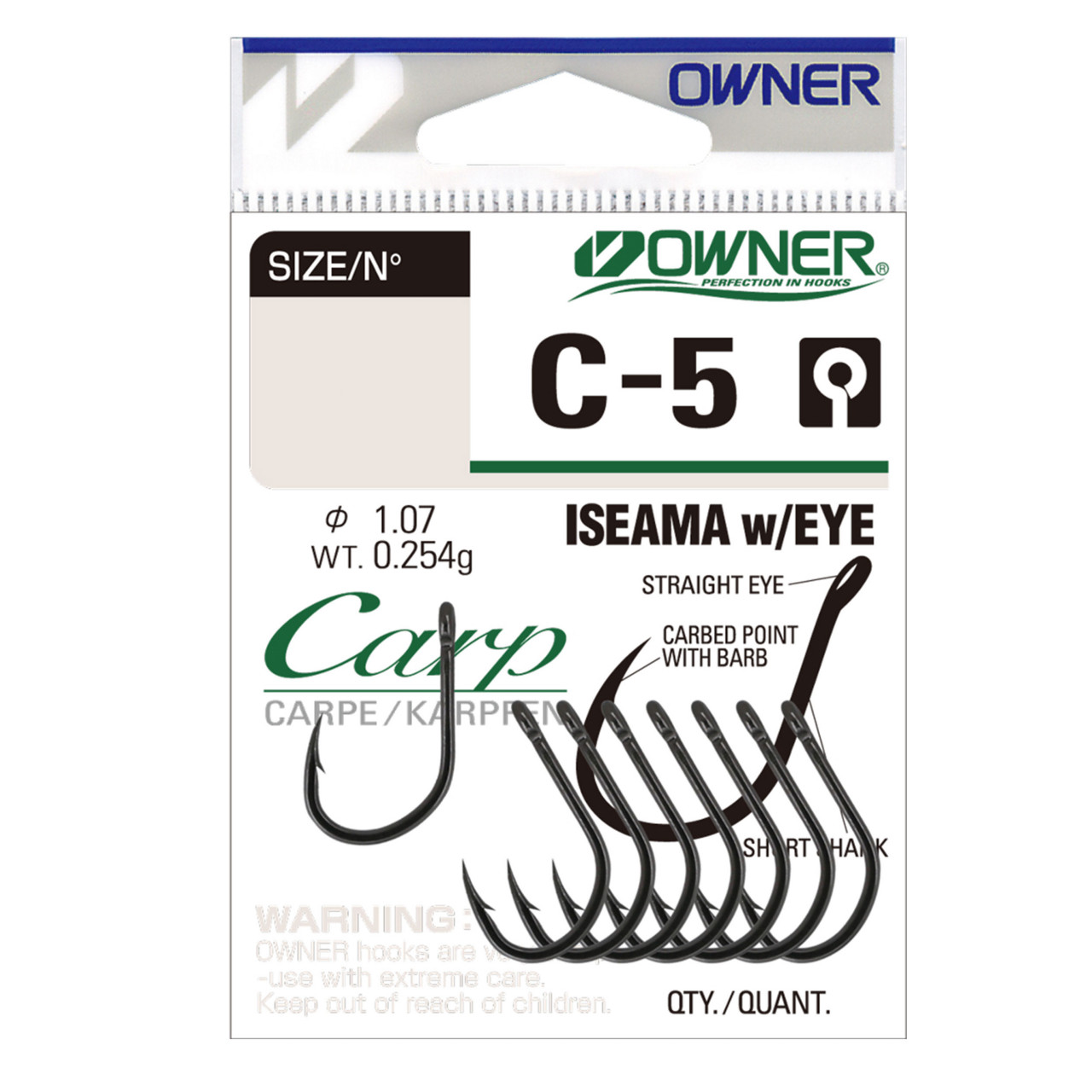 Carligele Owner din gama C-5 CARP ISEAMA with EYE fac parte din sortimentul CARP. Majoritatea tehnicilor de pescuit presupun experienta – pescuitul la crap cu atat mai mult. Carligele CARP ISEAMA with EYE au in vedere cateva principii – sa intepe foarte bine si eficient crapul, dar sa nu-l raneasca mai ales in momentul eliberarii, sa aibe legatura pe ochet astfel incat sa permita nodul fara nod si fir de par. C-5 sunt fabricate din sarma de otel Hi-CARBON tratata electrochimic, au varf CUTTING POINT si se preteaza foarte bine atat monturilor pe fir textil cat si celor pe fluorocarbon. Sunt carlige cu tija foarte scurta si varful proiectat undeva pe la jumatatea tijei, ce par sa fie unele dintre cele mai eficiente pentru MONTURA SIMPLE HAIR RIG (adica montura clasica pe fir de par). O bucla la capatul firului de par urmata de nodul fara nod si gata, montura este pregatita sa-si primeasca momeala si sa intepe primul crap. De-a lungul timpului, montura cu fir de par a fost practic fundatia pe care s-au dezvoltat si cladit sute de variante ale acesteia, fiecare potrivita diverselor situatii sau conditii de pescuit.