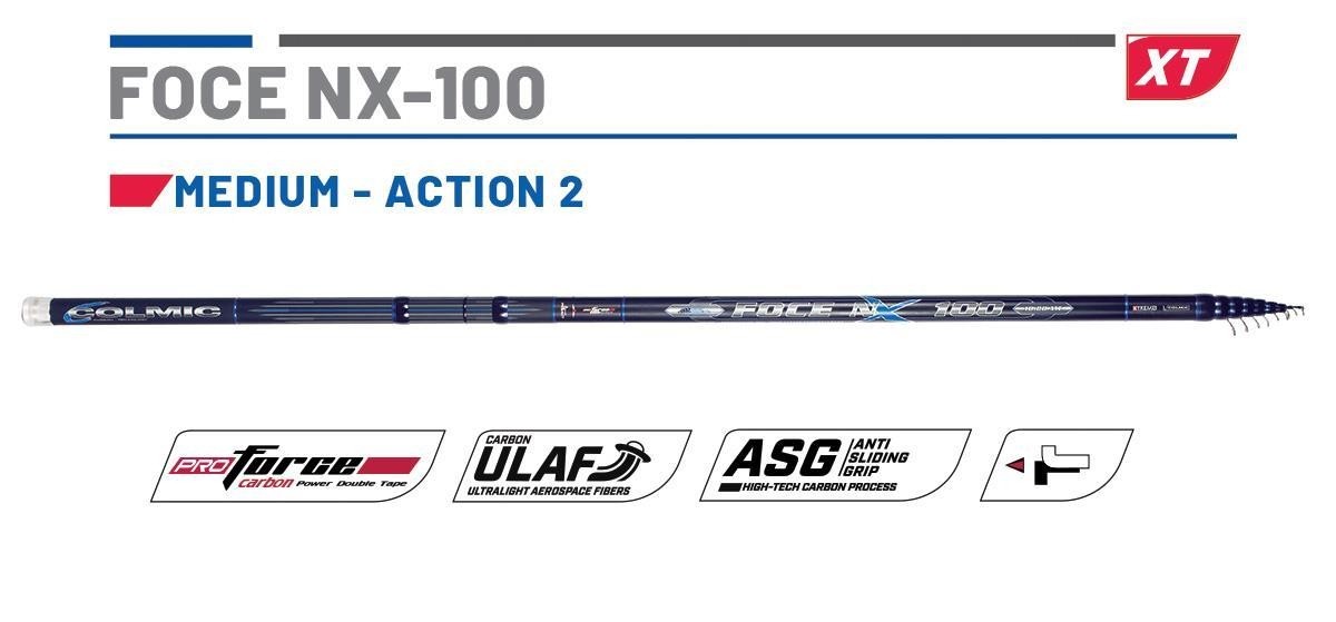 FOCE NX 100 este o lanseta bologneza telescopica, fabricata in jurul unui blank rigid din carbon ULAF (Ultralight Aerospace Fibers), ceea ce ii confera o rezistenta iesita din comun. Blank-ul este echipat cu inele Minimal Guide YDG-1, ce permit culisarea lina a liniei principale. Pentru protectia acestor inele la transport lanseta este livrata impreuna cu un manson special din plastic, ce se prinde de blank cu ajutorul unor benzi din cauciuc. Pentru fixarea eficienta a mulinetei a fost utilizata o mandrina Premium ALPS, foarte usoara si rezistenta, care aproape ca nu incarca blank-ul si contribuie de asemenea la reducerea greutatii totale a lansetei.