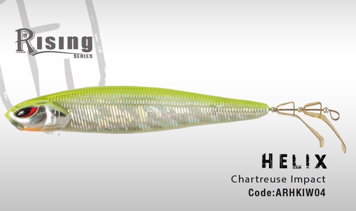 Vobler echipat cu doua lame rotative care actioneaza in sens opus, il propulseaza si maresc vibratiile in timpul recuperarii. Face parte din seria Rising atat prin calitatea componentelor si finisajului, cat si prin designul inovator. Cele doua lame imbunatatesc actiunea elicelor, crescand vibratiile semnificativ. Rotatiile constante ale celor doua lame, produc diferite sunete insotite de flash-uri de lumina, pe toate durata recuperarii, permintandu-va sa explorati o multime de apa, rapid. Helix se va distinge prin abilitatea sa extraordinara, de a captura pestele in cele mai grele conditii.