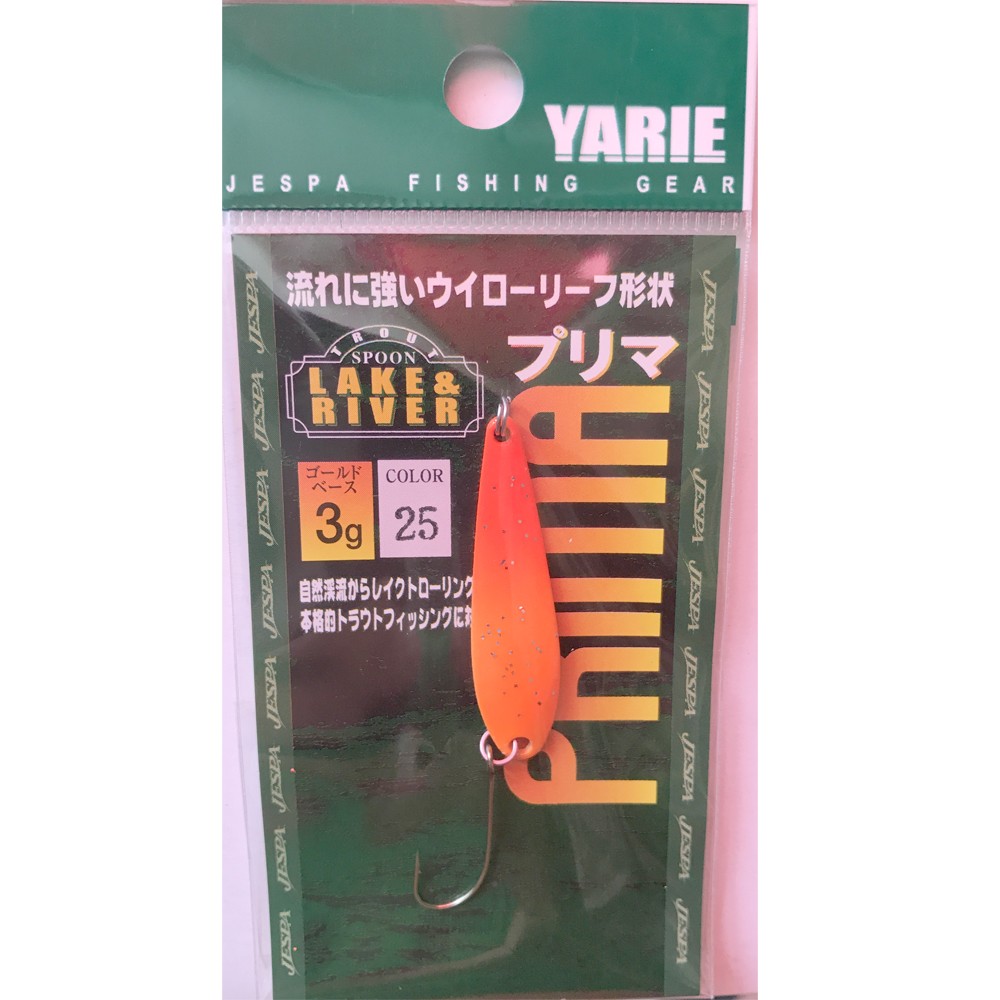 "PRIMA" is a willow leaf type spoon and features a sophisticated slender body shape. It moves as if it was dancing in the stream. It makes a quick fall to the targeted range and provides proper rolling and wobbling action and also has turning action just after casting. That is the evidence of its excellent design proven in the field.