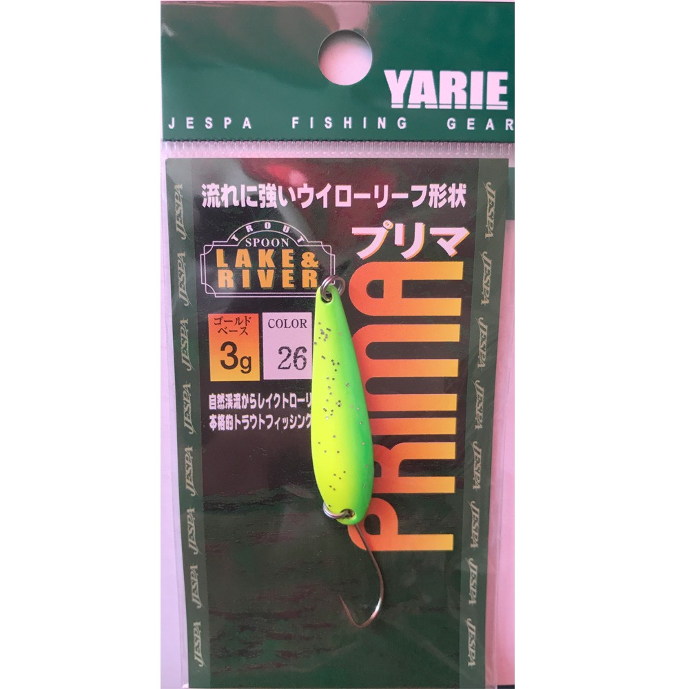 "PRIMA" is a willow leaf type spoon and features a sophisticated slender body shape. It moves as if it was dancing in the stream. It makes a quick fall to the targeted range and provides proper rolling and wobbling action and also has turning action just after casting. That is the evidence of its excellent design proven in the field.